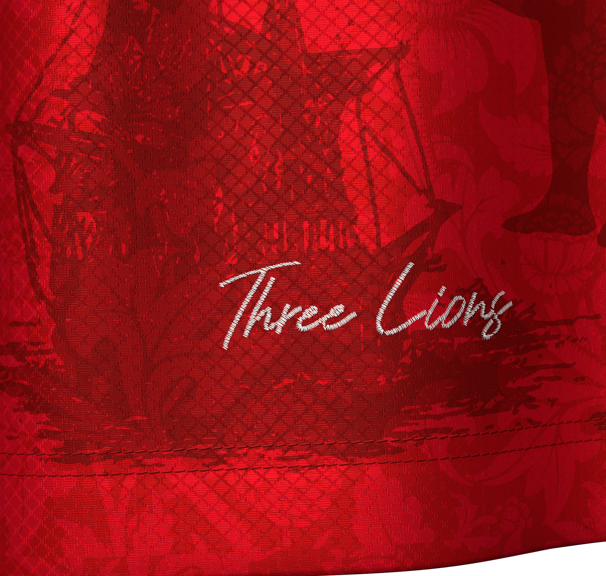 The KYORE crest and English emblem anchor the design, while “Three Lions” is embroidered near the hem as a proud signature.