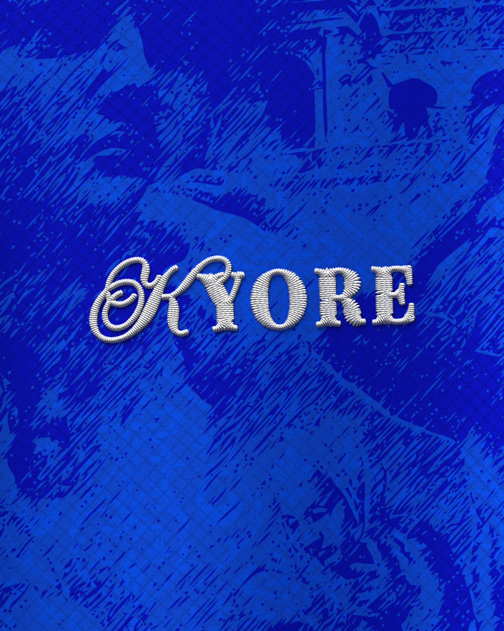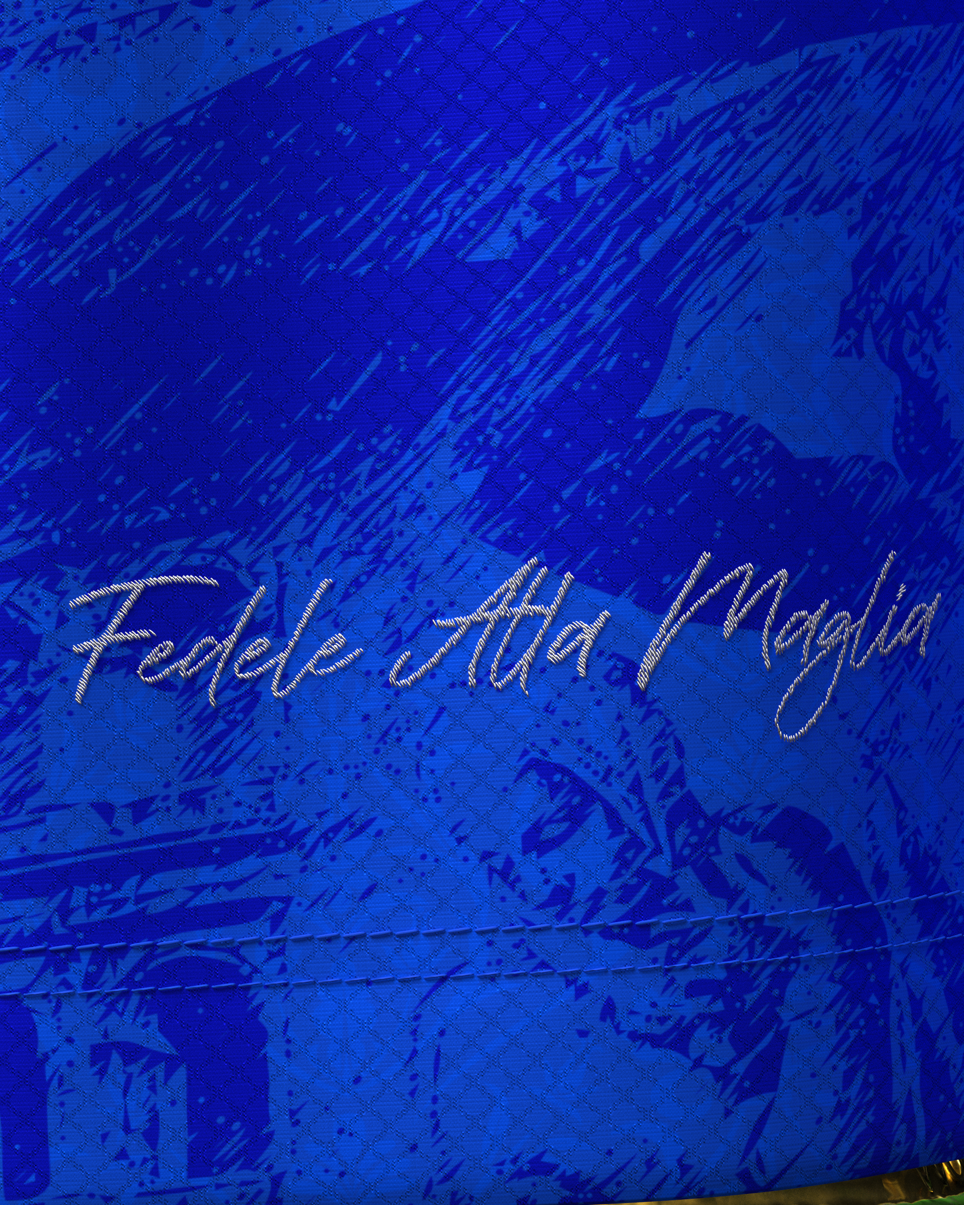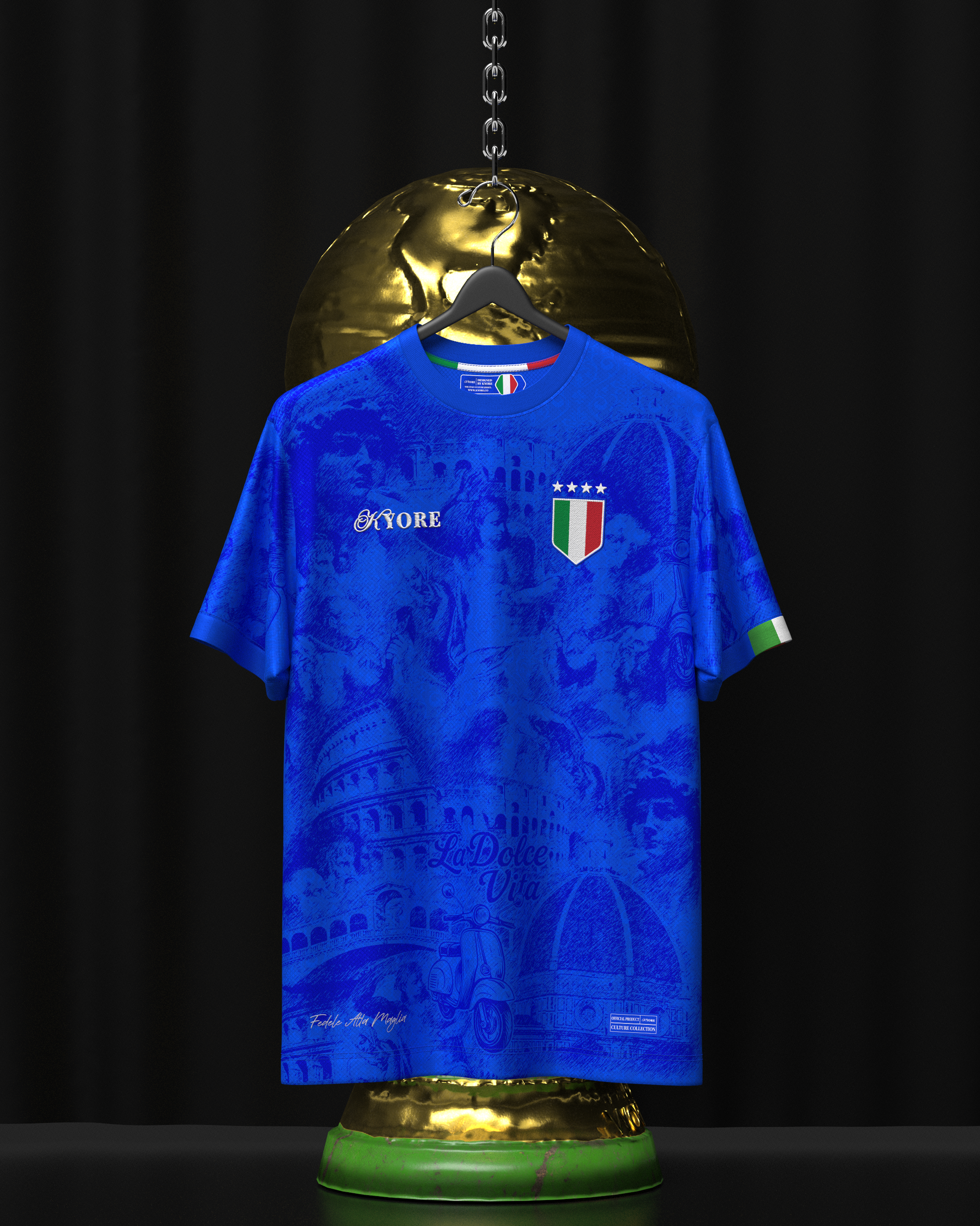 The KYORE crest and Italian shield are finely embroidered, with “Fedele Alla Maglia” stitched near the hem as a vow of loyalty.